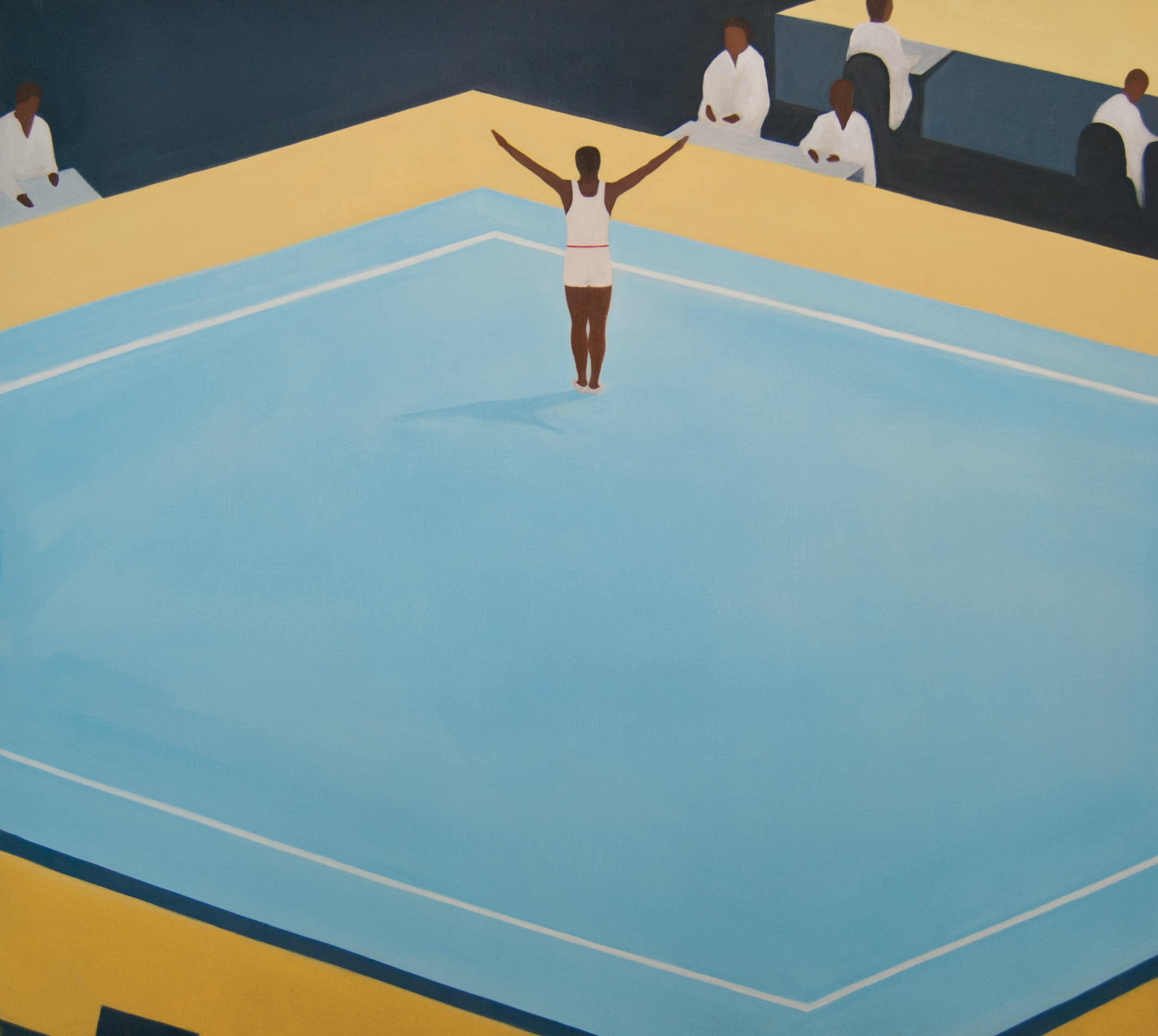 Son dernier travail explore les dynamiques de pouvoir à l’intérieur d’un gymnase, plongeant profondément dans les relations entre les performeurs, le public, les juges et les témoins. Nkosi, qui considère la performance comme un espace vulnérable à occuper, trouve des parallèles fascinants entre le monde de la gymnastique et son propre parcours en tant qu’artiste, naviguant entre la mise en avant de son travail et les multiples interprétations qui en découlent.